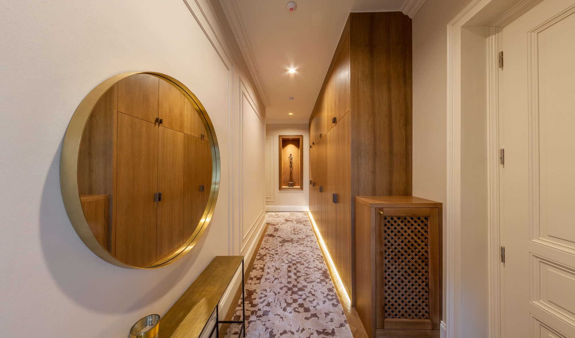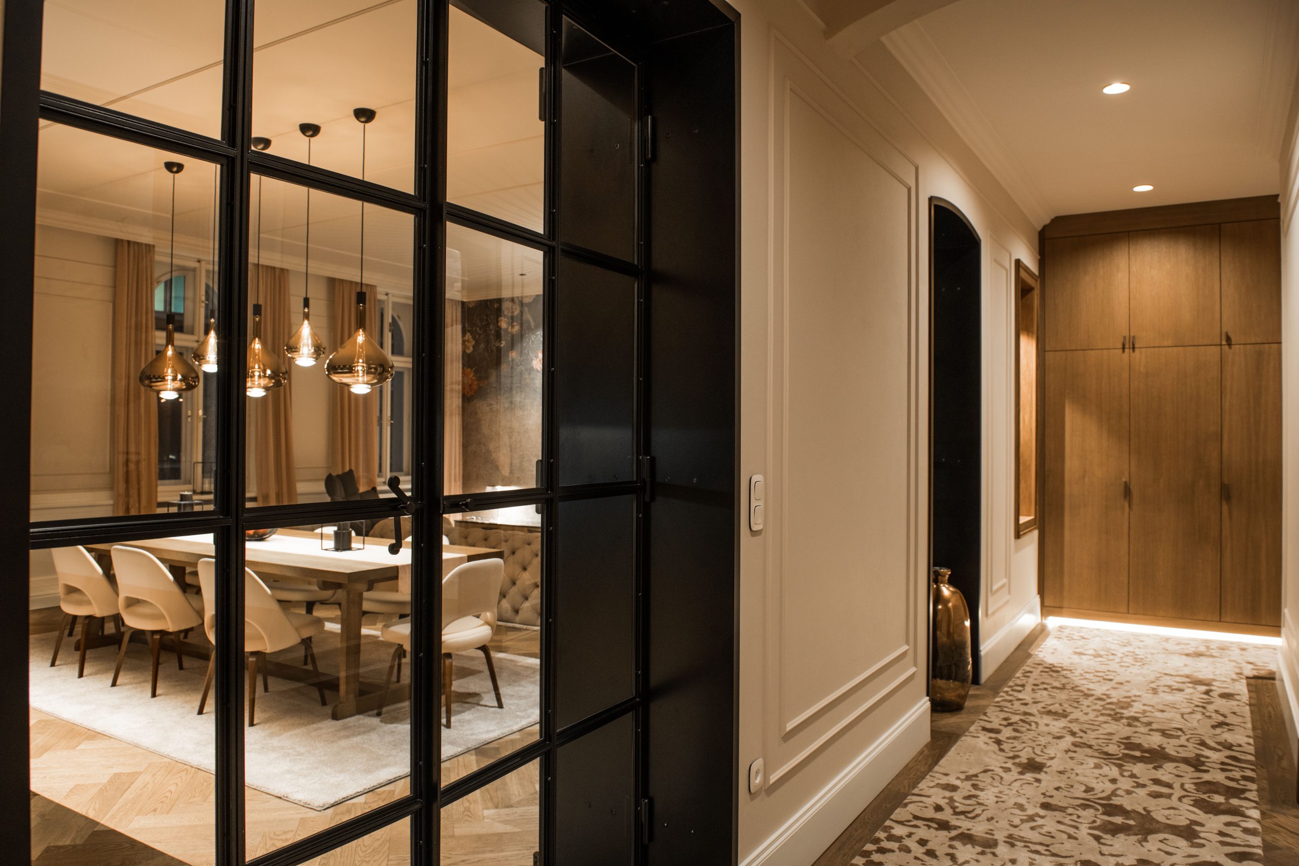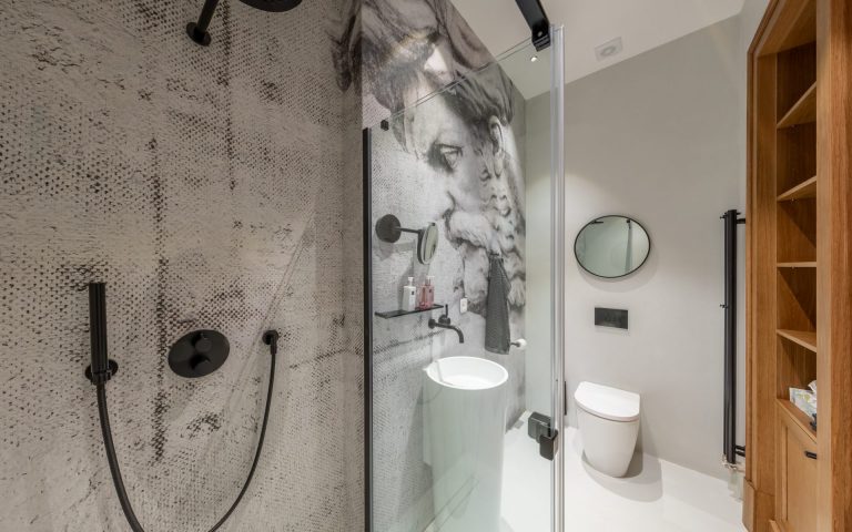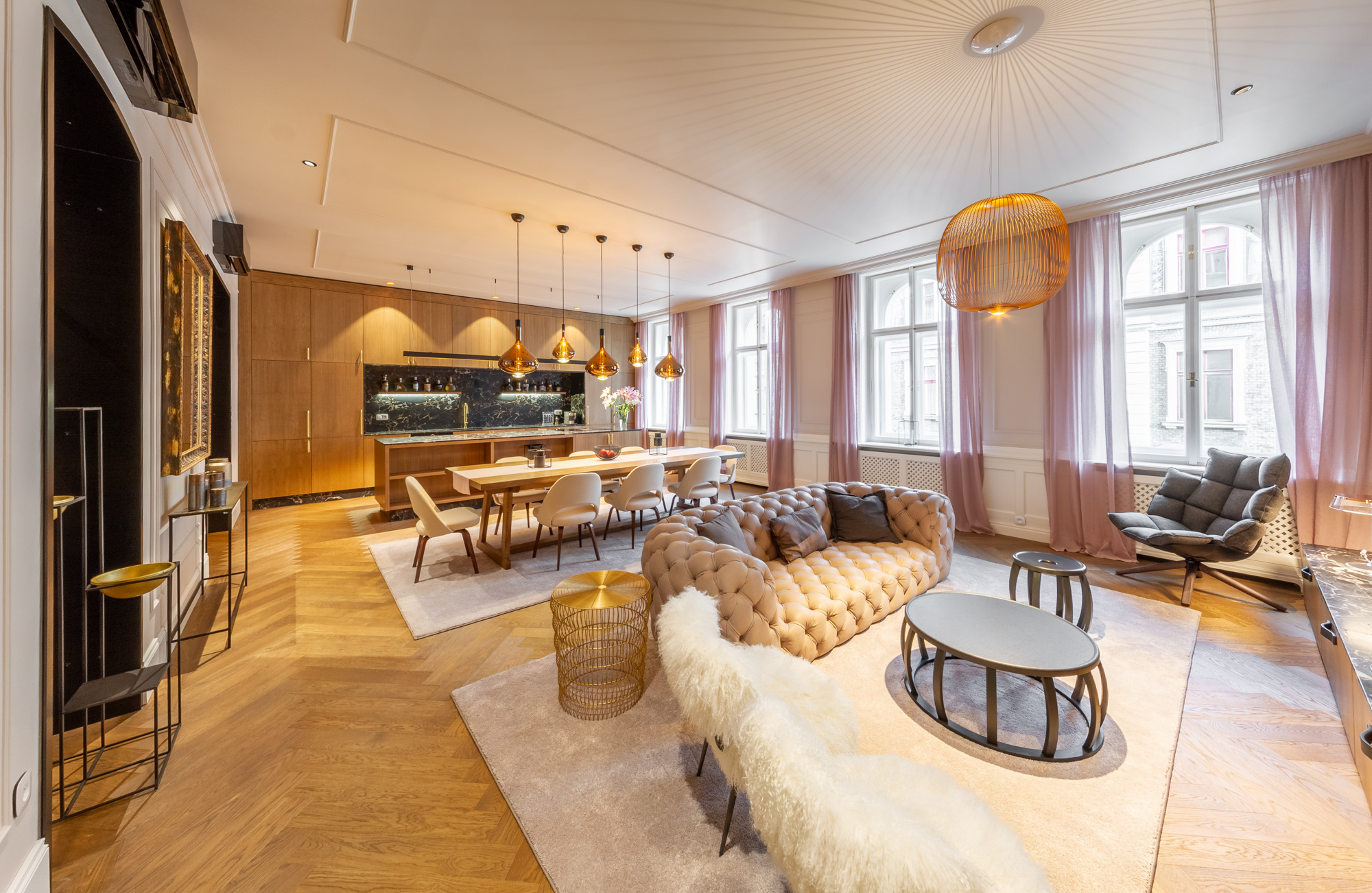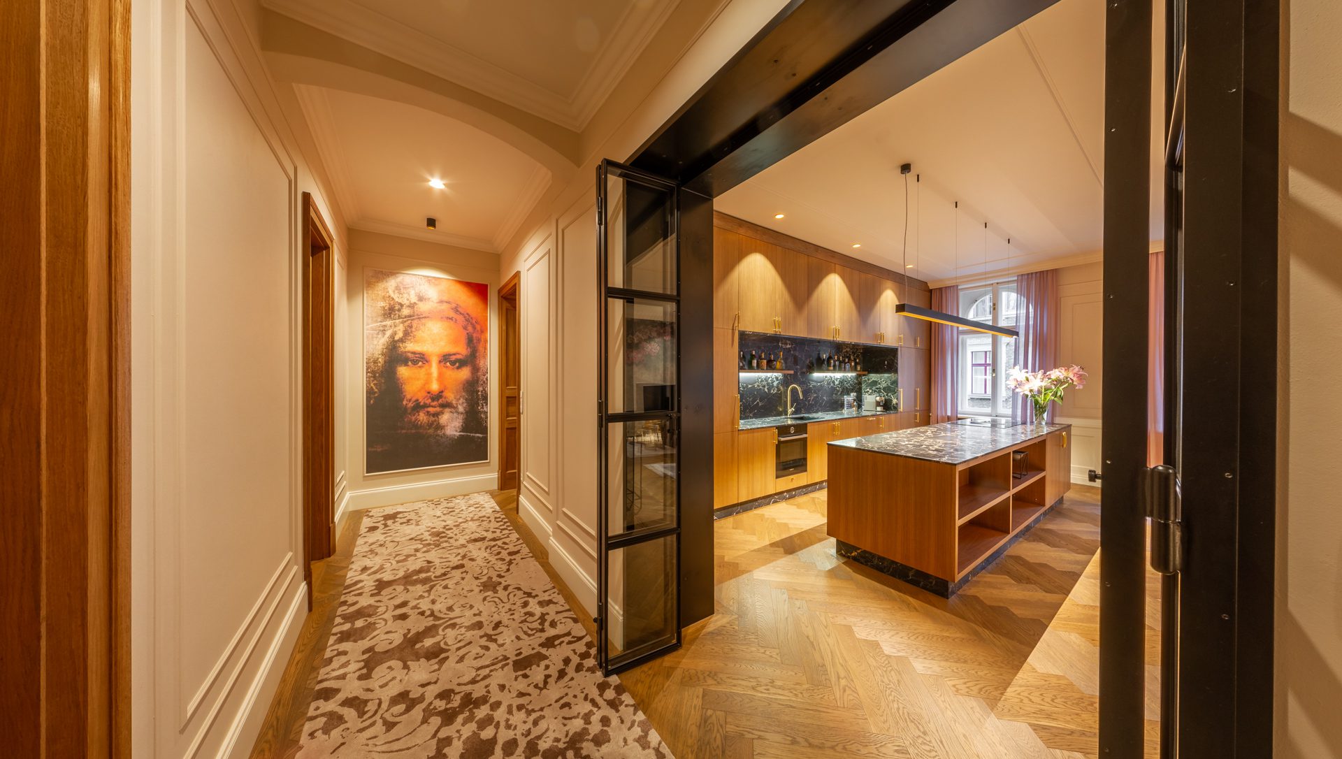 Dispozice bytu nabízí 61 m2 velký reprezentativní obývací pokoj s kuchyní a hlavní ložnicí s en-suite koupelnou, obojí orientované do ulice. Další 2 ložnice (jedna z nich s vlastní koupelnou) a lodžie (o velikosti 14 m2) jsou orientované do klidného vnitrobloku. Dále je zde prostorná vstupní hala/chodba s úložným prostorem a třetí koupelna s toaletou. Celková výměra tohoto opravdu výjimečného bytu je dle NOZ 175 m2, z toho lodžie o výměře 14 m2.